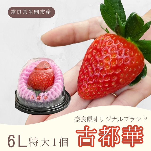 ■商品詳細 ・品名 :「古都華」のイチゴ1粒 ・品種 :古都華 ・内容量: 6Lサイズ(50g 以上)×1粒 ・産地 :奈良県生駒市 ・農家 :きよの杜農園 ■特徴 果皮はツヤのある赤色で香りが強く、糖度と酸度が高めで深みのある濃厚な味わいが特徴の「古都華」 2011年、奈良県生まれの品種です。 奈良県生駒市の生産者が育てたイチゴをお届けします。 ■こだわり きよの杜農園では奈良県生駒市の歴史ある竹林谷間で質の良い湧き水を使用しているため、甘くて美味しいイチゴが育ちます。 採れたて鮮度をお楽みいただくため、収穫当日に発送いたします。 また、完熟に近い状態で収穫するため1日の収穫量に限りがございます。 配送時に傷がついてしまわないよう、丁寧に梱包して発送しております。 私たちが丁寧に育てたイチゴを是非一度、ご賞味ください。 ■注意事項 ・気候などの影響でお届けまで日数を要する場合がございますので、予めご了承ください。 ・到着後は3日以内にお召し上がりください。 ・発送後のキャンセルは致しかねますので、予めご了承ください。 ・お客様のご都合による配達不能(不在など)は保障対象外となります。 その場合には商品代金、送料をご負担いただきますことをご了承の上、ご注文お願いいたします。